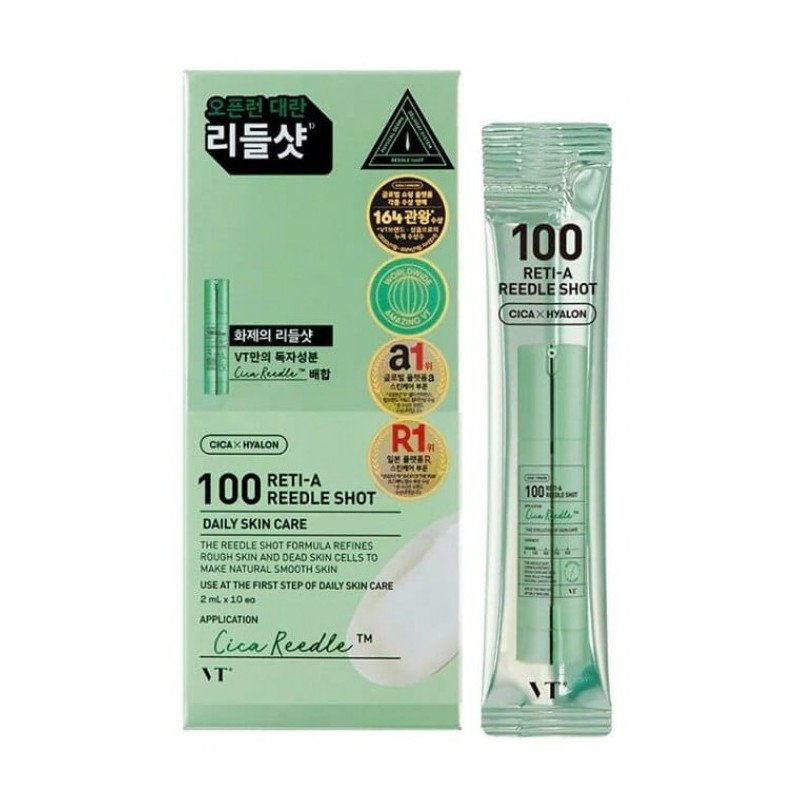VT COSMETICS 100 RETI-A REEDLE SHOT 2ml х 10pcs допомагає покращити стан шкіри та забезпечує зволоження. Ідеально підходить для щоденного використання, підтримуючи здоровий та сяючий вигляд.